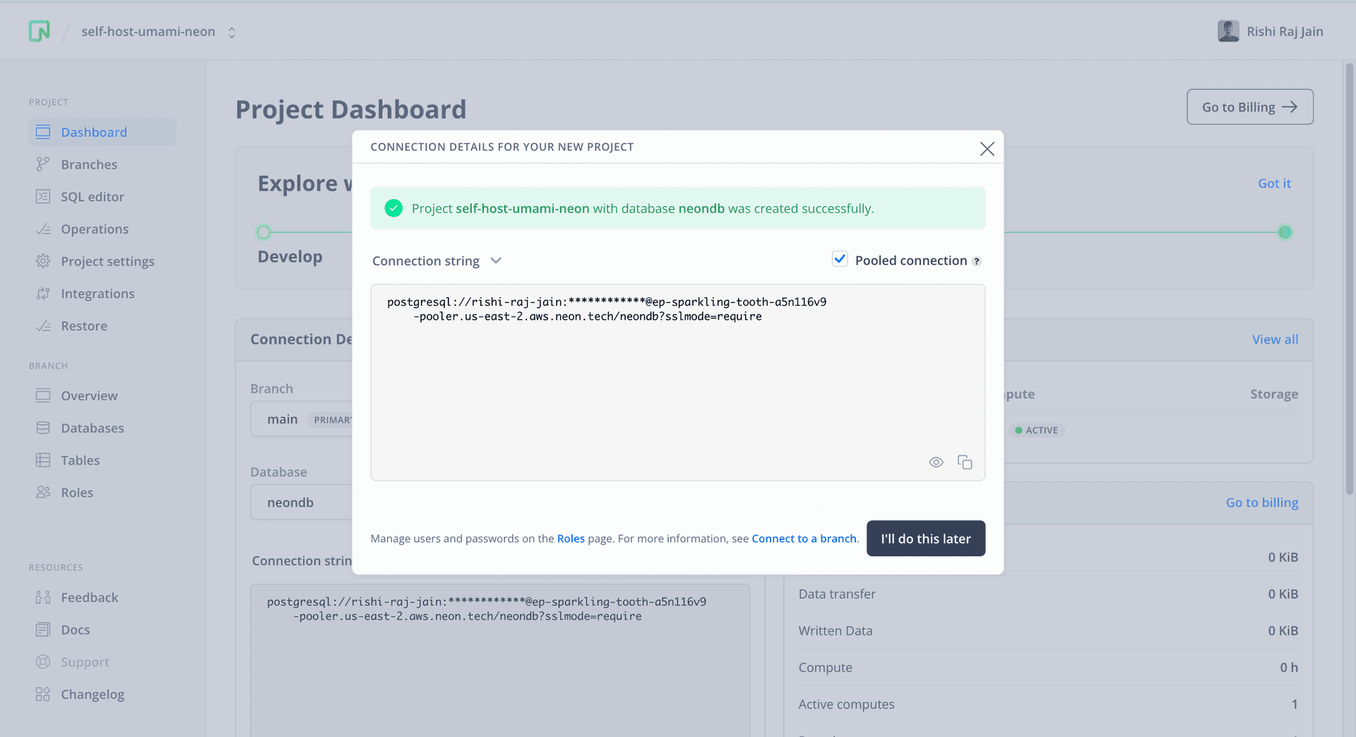 You will be presented with a dialog that provides a connection string of your database. Click on the Pooled connection option and the connecting string automatically changes to a pooled connection string.